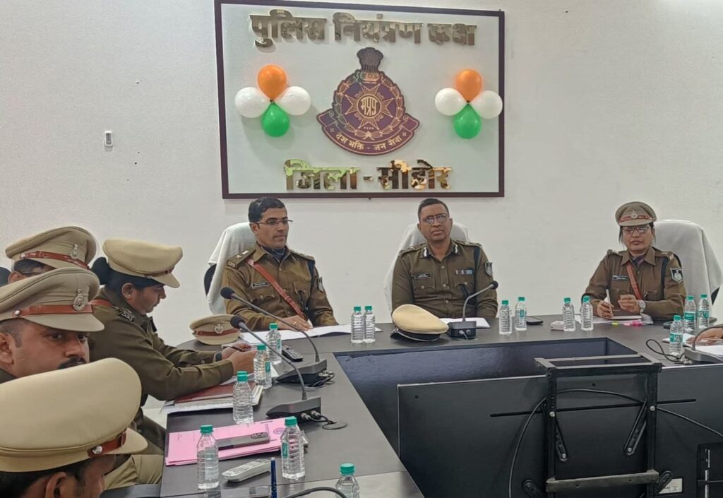 updatenews247.com धंनजय जाट सीहोर 7746898041- पुलिस महानिरीक्षक देहात जोन भोपाल श्री अभय सिंह द्वारा पुलिस अधीक्षक कार्यालय के सभाकक्ष में सभी राजपत्रित अधिकारी एवं थाना प्रभारियों की बैठक ली। बैठक में गंभीर अपराध, प्राप्त सफलताये, जागरूकता अभियान, कॉम्बिग गस्त, चिन्हित अपराध, मुस्कान अभियान, संगठित अपराध, मादक पदार्थ, सम्पत्ति संबंधी अपराध की बरामदगी, कानून-व्यवस्था की स्थिति, कुबरेश्वरधाम, आवंलीघाट, देवीधाम सलकनपुर, व्हीआईपी भ्रमण, जिले की बल की स्थिति, प्रशासकीय भवन,