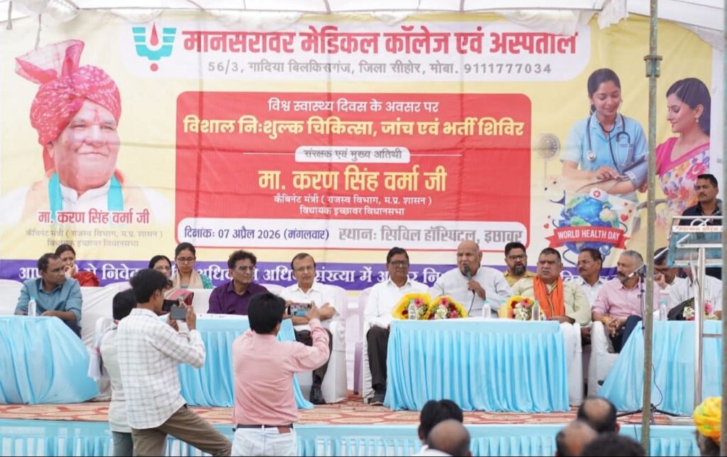 सीहोर, 07 अप्रैल, 2026 राजस्व मंत्री श्री करण सिंह वर्मा ने इछावर सिविल हॉस्पिटल में मानसरोवर मेडिकल कॉलेज द्वारा आयोजित निःशुल्क स्वास्थ्य परामर्श शिविर का शुभारंभ किया। इस अवसर पर उन्होंने स्वास्थ्य सेवाओं के महत्व पर प्रकाश डालते हुए आमजन को शिविर का लाभ लेने के लिए प्रेरित किया। इस अवसर पर उन्होंने कहा कि अच्छा स्वास्थ्य ही मानव जीवन की सबसे बड़ी पूंजी है और समय-समय पर स्वास्थ्य परीक्षण कराना अत्यंत आवश्यक है। उन्होंने कहा कि हर व्यक्ति को सुलभ एवं बेहतर स्वास्थ्य सेवाएं उपलब्ध कराने के लिए सरकार निरंतर कार्य कर रही है। शिविर में महिला रोग, हड्डी रोग, शिशु रोग, नेत्र, ईएनटी सहित विभिन्न विशेषज्ञ डॉक्टरों द्वारा मरीजों का परीक्षण किया गया एवं परामर्श दिया गया। शिविर में कुल 384 मरीजों का स्वास्थ्य परीक्षण किया गया तथा निःशुल्क दवाइयों का वितरण किया गया। साथ ही ईसीजी, ब्लड प्रेशर एवं शुगर की जांच भी की गई। इस अवसर पर एसडीएम श्रीमती स्वाति मिश्रा, सीएमएचओ डॉ सुधीर डेहरिया, मानसरोवर ग्रुप के प्रो-चांसलर ईआर. गौरव तिवारी सहित जनप्रतिनिधि, एवं अन्य सदस्य उपस्थित थे।