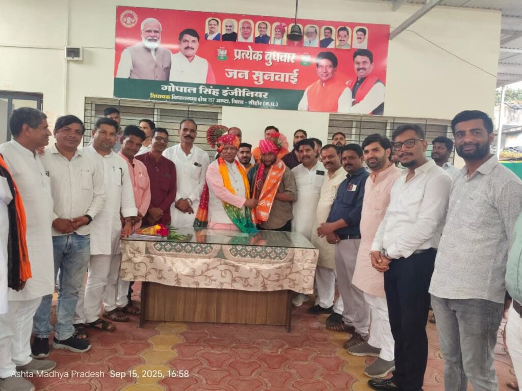 updatenews247.com धंनजय जाट आष्टा 7746898041- गत दिवस सकल समाज द्वारा आयोजित की गई विजयदशमी उत्सव समिति के अध्यक्ष के निर्वाचन की बैठक में विजयदशमी उत्सव समिति 2025 के चुने गये नवनिर्वाचित अध्यक्ष राहुल वाल्मीकि का आज विधायक गोपालसिंह इंजीनियर के कार्यालय पर विधायक गोपालसिंह इंजीनियर ने भव्य स्वागत और सम्मान किया । इस अवसर पर भारतीय जनता पार्टी के बड़ी संख्या में कार्यकर्ता भी उपस्थित रहे । स्वागत उपरांत विधायक गोपालसिंह इंजीनियर ने