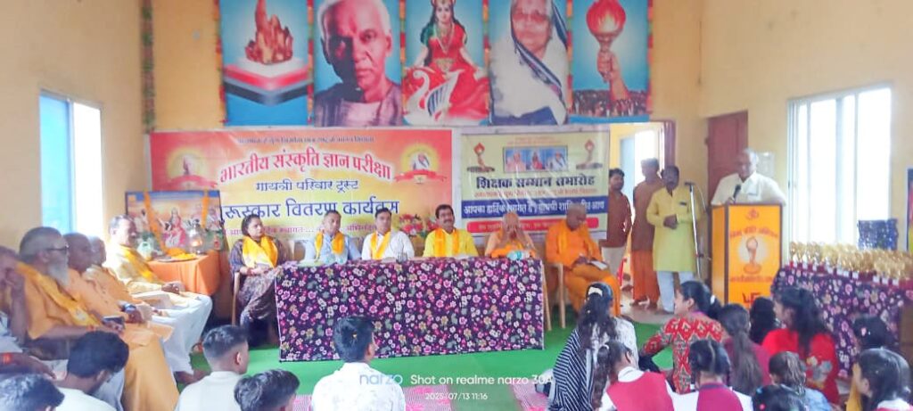 updatenews247.com धंनजय जाट आष्टा 7746898041- अखिल विश्व गायत्री तीर्थ शांतिकुंज हरिद्वार के तत्वाधान में गायत्री शक्तिपीठ आष्टा द्वारा आयोजित भारतीय संस्कृति ज्ञान परीक्षा सत्र 2024- 25 प्रतिभावान मेरिट प्राप्त विद्यार्थियों का पुरस्कार वितरण, सेवानिवृत शिक्षक एवं शिक्षक सम्मान समारोह गुरु पूर्णिमा के पावन अवसर पर किया गया। कार्यक्रम की अध्यक्षता प्रमुख समाज सेवी बाबूलाल पटेल जावर, मुख्य अतिथि श्री मुकेश कुमार यादव उपसंचालक सामाजिक न्याय एवं निशक्त जन कल्याण विभाग सीहोर ,विशेष अतिथि आर पी हजारे जोन प्रभारी भोपाल, विशेष अतिथि अजब सिंह राजपूत बीआरसीसी आष्टा